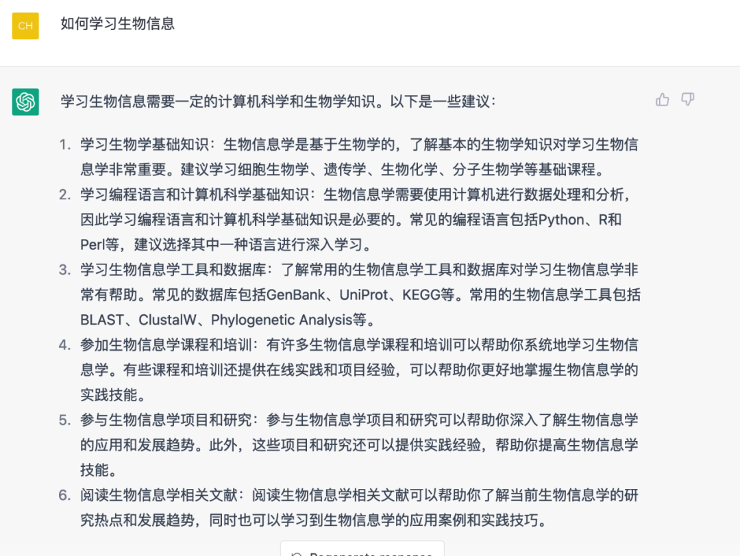 登录上去是一个很简洁的页面,输入文字,开启聊天。先问第一个问题“如何学习生物信息”,给出回答如下,有板有眼,很条理,读着也是常规的建议,很像大部分公众号的文章,看着是这么回事,实则帮助也不太大。这也是因为问题很泛泛,也只能泛泛的答。