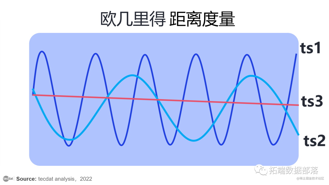 以图中的示例为例。我们有树时间序列:ts1、ts2 和 ts3。我们希望检测两条正弦曲线彼此相似,因为它们具有相同的形状和上下趋势,即使它们的相位和频率略有不同。但是,如果我们计算欧几里得指标,直线 ts3 的结果更接近 ts1。