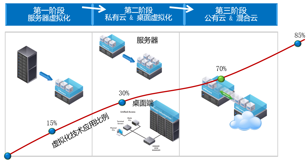 图1梳理了云计算的发展阶段,主要分为:服务器虚拟化阶段、私有云&桌面虚拟化阶段、公有云&混合云阶段。而虚拟化技术作为云计算实现的重要支撑,在发展过程中被应用的比例越来越高,从这一规律表明,云计算攻防的主要关注点其实是虚拟化技术。