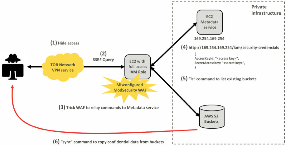 图5展示了2019年Capital One公司发生的攻击事件原理,攻击者通过结合SSRF漏洞与元数据服务获取到了角色的临时凭据,然后利用该凭据横向移动至AWS S3存储桶中,最终窃取了S3存储桶中的敏感数据。
