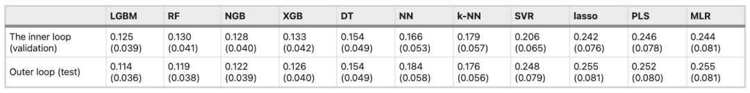 表1:各机器学习模型嵌套交叉验证中预测性能情况