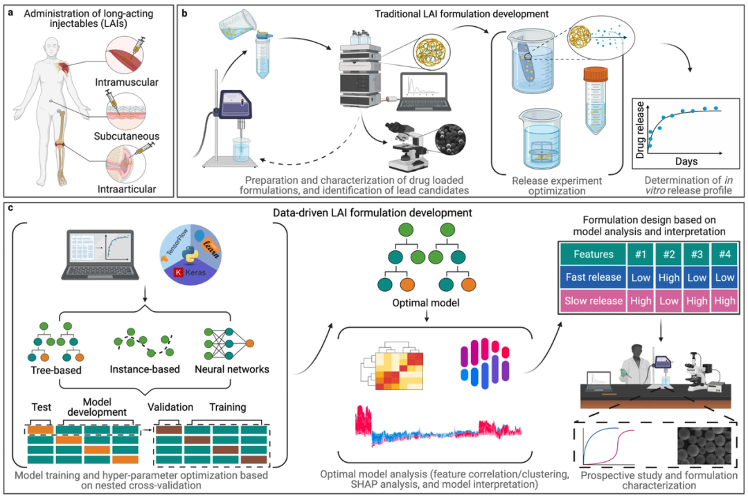 c 图:本研究的工作流程概览,即用训练好的机器学习模型加速长效注射剂制剂研发过程。