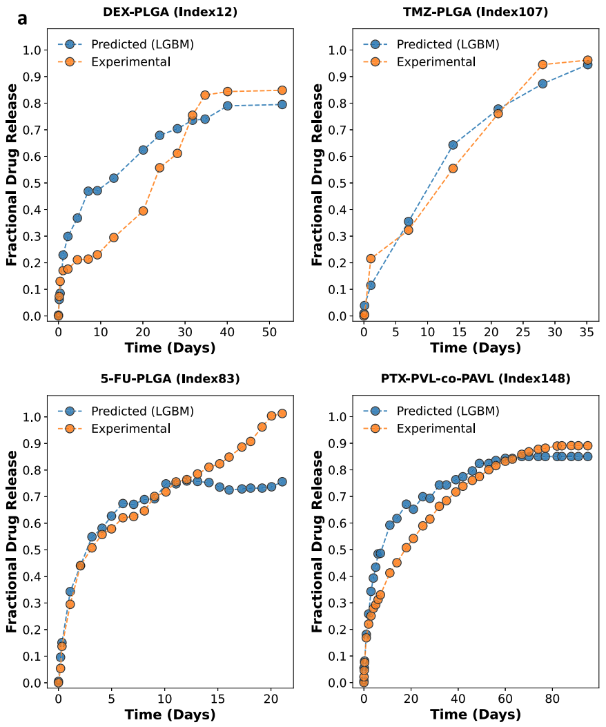 图 4 显示了某种所选长效注射剂的预测和实验药物释放曲线的比较,图 5 则显示了药物-聚合物的药物释放曲线和实验药物释放曲线比较,可以看到在两种情况下,预测值和实验值均基本一致,因此,研究人员认为基于 LGBM 算法的模型能够准确预测长效注射剂药物释放速率。