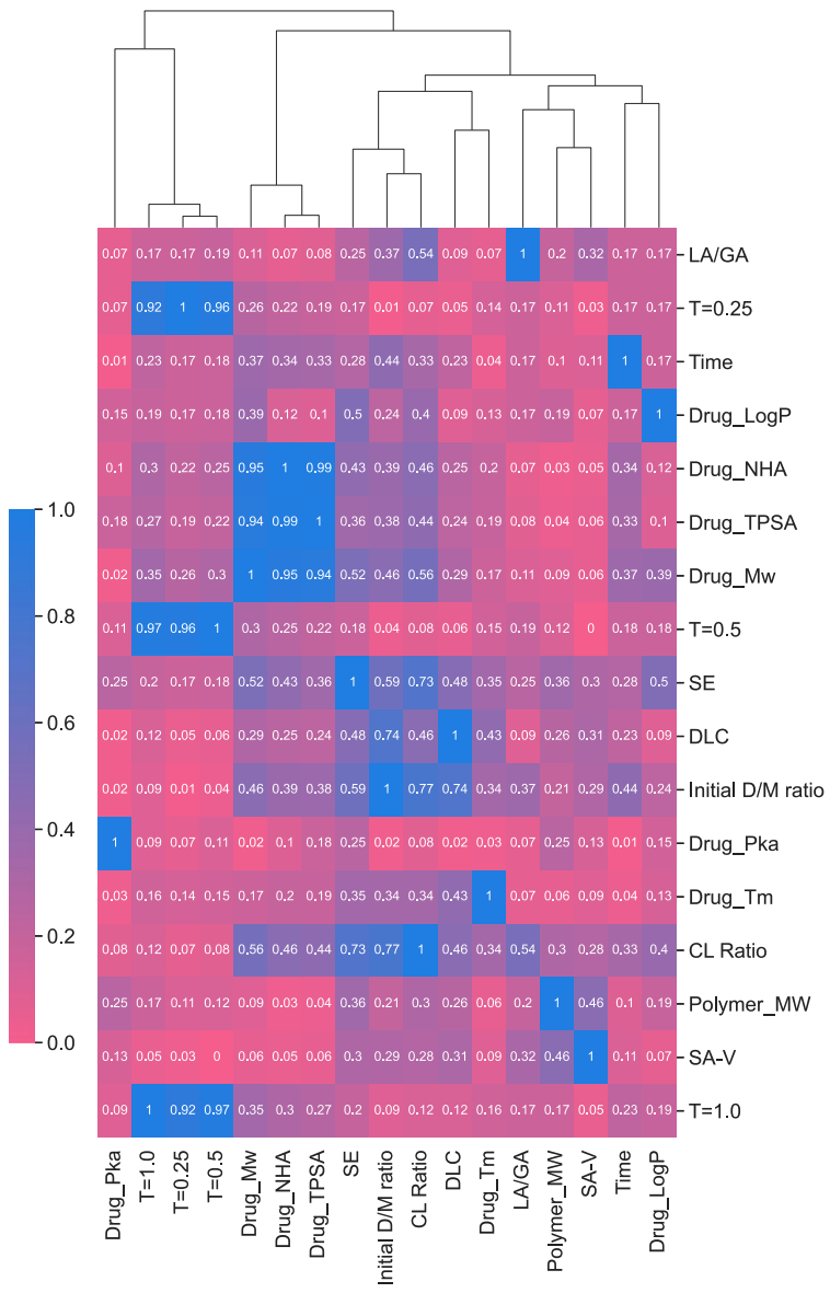 深蓝色表示绝对 Spearman 相关系数 (根据等级资料研究两变量间相关关系的方法) 为 1,粉色表示绝对 Spearman 相关系数为 0。热力图旁边附有一个树形图,显示通过聚合层次聚类分析确定的特征集群的层次结构。