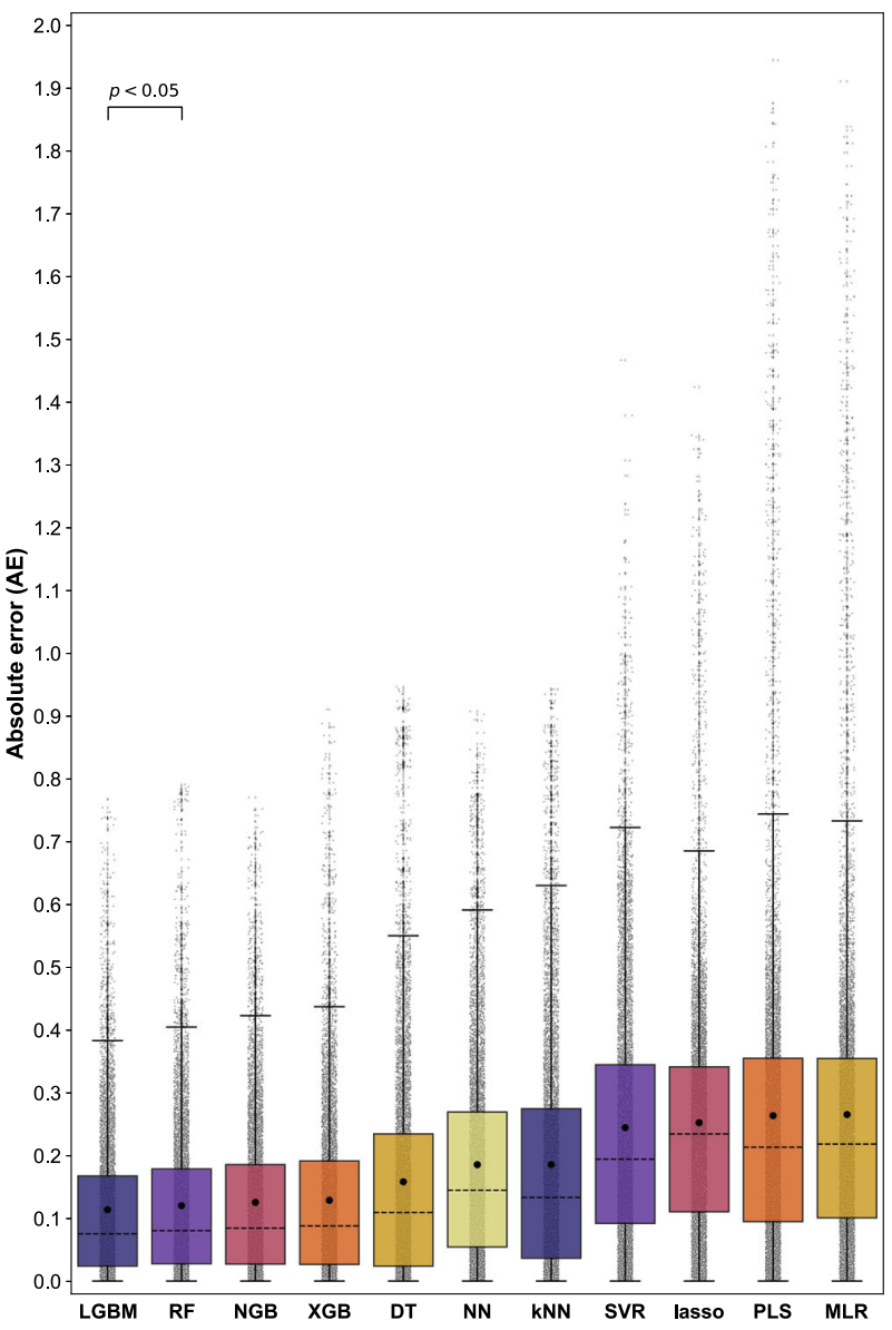 本项研究中,研究人员共训练了 11 种机器学习算法,包括多元线性回归 (MLR)、最小绝对值收缩和选择算子 (Lasso)、偏最小二乘回归 (PLS)、决策树 (DT)、随机森林 (RF)、光梯度增强机 (LGBM)、极端梯度增强 (XGB)、自然梯度增强 (NGB)、支持向量回归 (SVR)、 k 最近邻算法 (k-NN) 以及神经网络 (NN)。