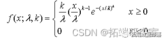 Weibull分布可以对于厚尾性质有所度量。当然其他类型的如Beta分布,__对数正态、Gumbel分布等也可以度量厚尾,具体的思路和计算方法与此相同,这里主要以Weibull分布为例进行介绍。Weibull分布密度函数形式如下: