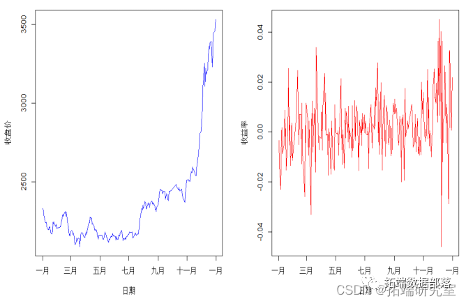 re<log(HS300$close\[2:n\]/HS300$close\[1:(n-1)\]) #计算日收益率par(fro=c(1,2)) 将图表工作区分为2列画图区plt(HS300dte,HS00$close,typ='l',col'b,xlab='日期', ylab='收益率') #画出日收盘价和日收益率的时序图
