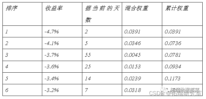 表中0.05位于排序1和2之间的收益率,即-4.7%和-4.1%之间,则可以使用线性插值法计算VaR=(0.05-0.0391)/(0.0736-0.0391)×(-4.1%)+(0.0736-0.05)/(0.0736-0.0391)×(-4.7%)=-4.51%,即利用混合时间加权法得出的95%置信水平下的VaR是4.51%。