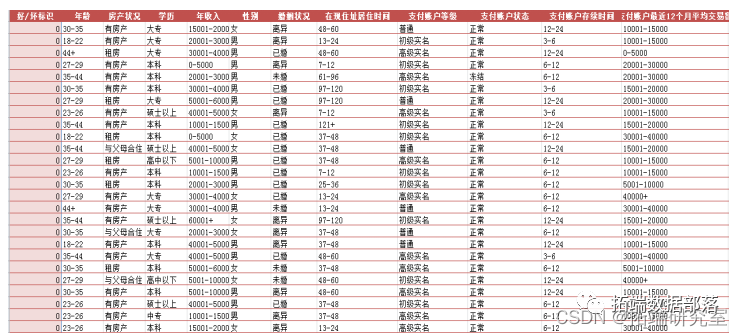 如下所示的表格是某个需要分类的样本的训练集和测试集(只显示前27行)。该样本是某互联网企业注册用户的信用调查表,调查了用户的年龄、性别、收入、住房、居住时间等状况,同时收集了支付账户等级、支付金额等数据,并且按照其之前的违约情况,将客户分成了好客户和坏客户。总的客户数量有3万个,其中坏客户(有过明确违约情况的)仅有688个。将前15000个作为训练样本,后15000个作为需要分类验证的样本。