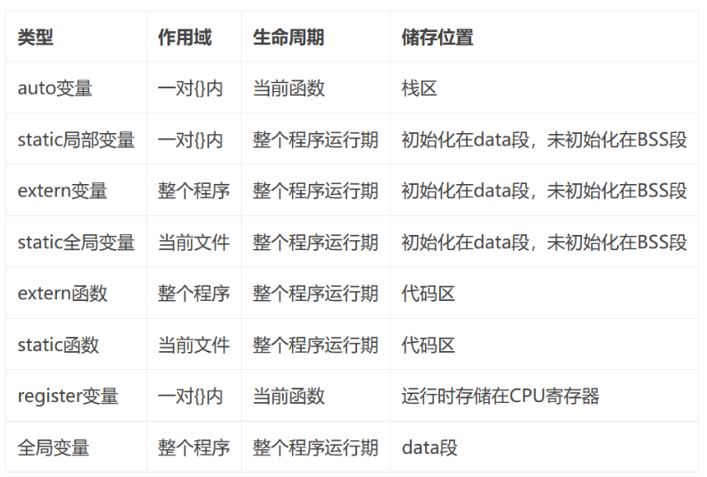 C/C++中由(auto、 extern、 register、 static)存储类别和对象声明的上下文决定它的存储类别。