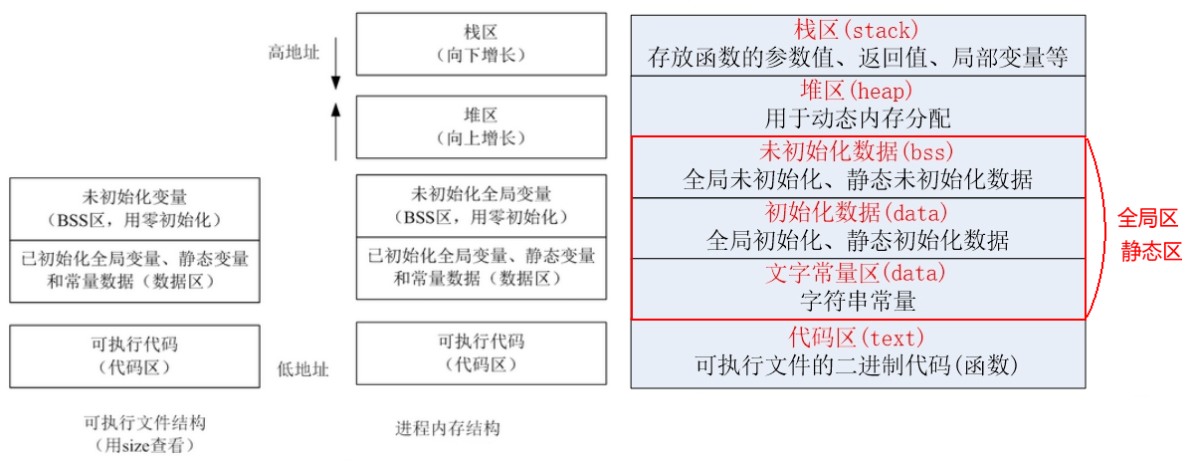 程序在加载到内存前,代码区和全局区(data和bss)的大小就是固定的,程序运行期间不能改变。然后,运行可执行程序,系统把程序加载到内存,除了根据可执行程序的信息分出代码区(text)、数据区(data)和未初始化数据区(bss)之外,还额外增加了栈区、堆区。