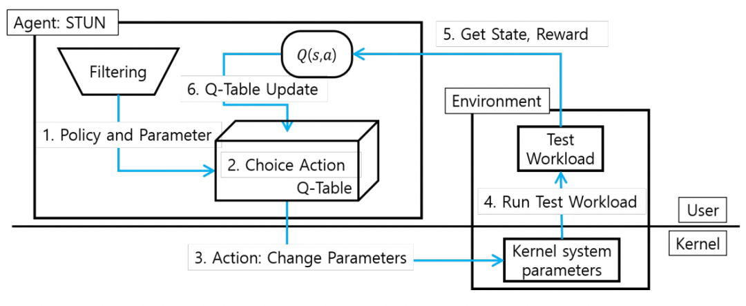 下显示了STUN的结构。STUN由环境模块和代理模块组成。环境模块定义了内核参数优化的环境,代理模块定义了Q学习算法并执行代理。