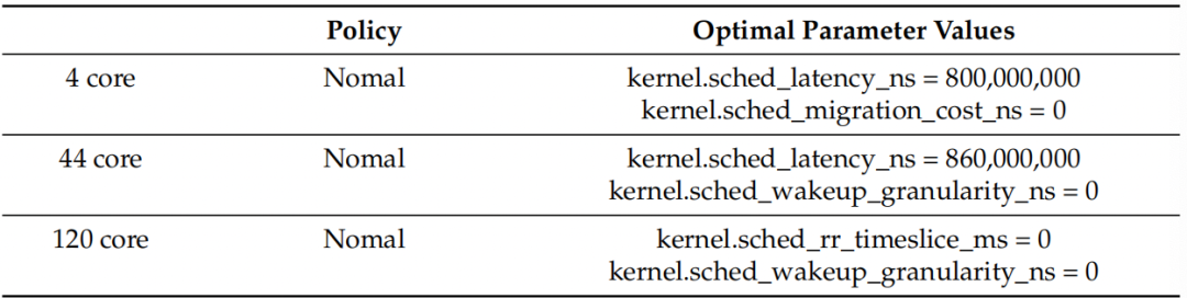 调度程序的性能影响在很大程度上取决于核心数量,这归因于调度程序的功能。因此,该论文比较了在4核、44核和120核机器上通过STUN对Sysbench的性能改进。Sysbench线程选项设置为每台机器CPU核心数的10倍。此外,策略和参数设置为通过过滤过程获得的最佳值。表3显示了通过STUN为每个核心数优化Sysbench的调度程序策略和参数值。