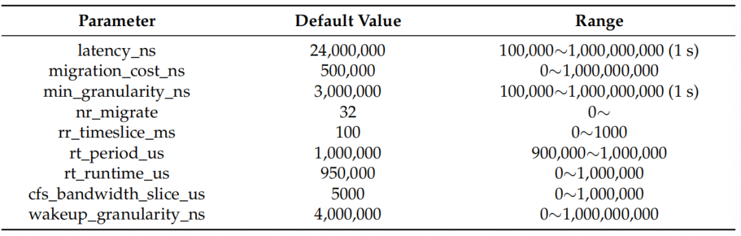 Linux内核提供了14个调度器参数进行优化。该论文对其中9个参数进行了优化,并排除了不影响性能的五个参数。下表显示了可以更改的参数值范围和Linux内核的默认值。它们可以使用Linux提供的sysctl命令在不重新启动机器的情况下更改。
