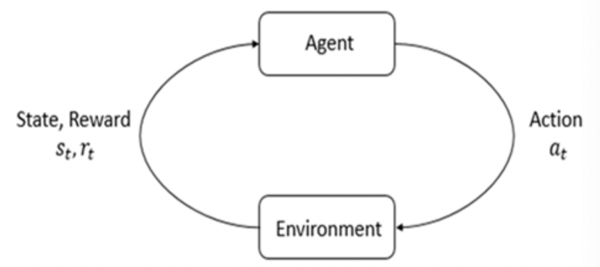 强化学习是一种机器学习算法,它建立了一个策略,以确定在当前状态下总补偿值最大的行为。它由环境和代理组成,如下图所示。代理是确定下一个执行操作的主体,通过行动与环境交互,环境则回应状态和奖励。代理不断与环境交互以建立最优策略。