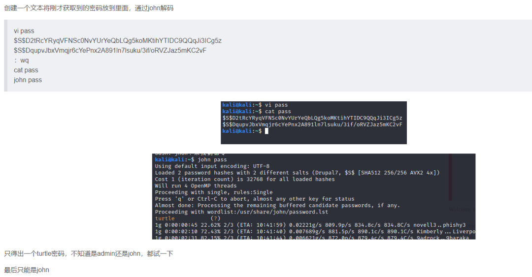 获取到admin和john密码加密后的密文 然后新建一个pass.txt 把密文放进去使用john 进行破解 密码:turtle
