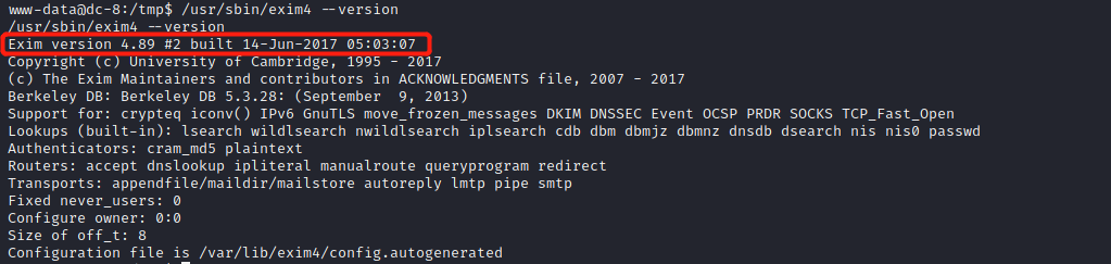 使用find命令查找具有suid权限的命令,找到一个exim4命令,exim是一款在Unix系统上使用的邮件服务,exim4在使用时具有root权限