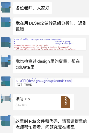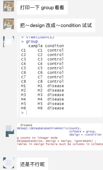 所以小伙伴们给他的建议很简单,就是根据实际情况去修改 design = ~ group,它里面的group是数据框了,并不是之前的metadata这个数据框里面的一个列 :