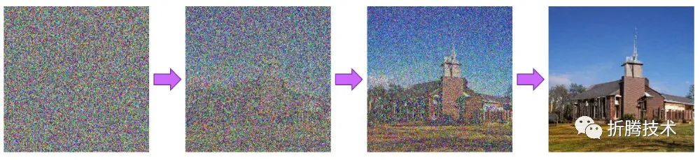 简单来说是通过生成一副用户指定大小的充满随机噪声的图片(可以想象为充满雪花点的图),通过上面的算法,将噪音中的元素(蓝天、建筑物、草地)一步步的还原成我们想要的内容,并进行组装,最终成为图片(晴天广阔的草地上有一座建筑物)。