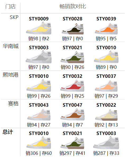 不同的门店销售状况会有差异,比较它们的畅销款有助于优化存货位置,进行更快的货品周转。