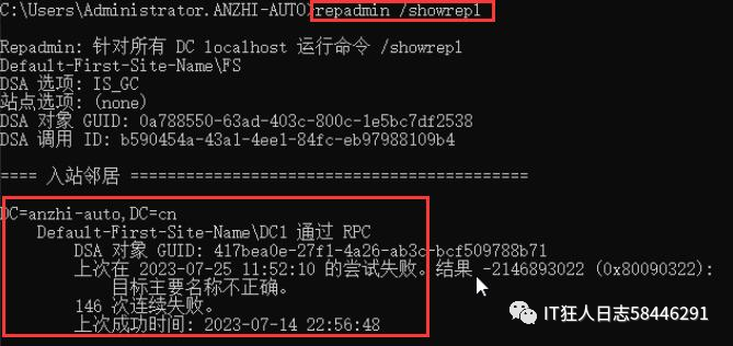 显然,两台AD之间的复制出现问题了,用repadmin /showrepl 命令显示AD复制问题,也是同样原错误信息。