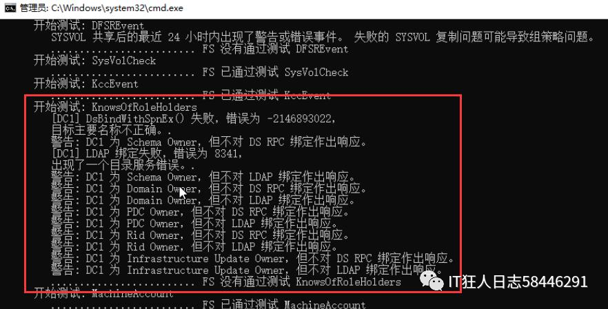 在这台文件服务器上执行命令:dcdiag,发现KnowsOfRoleHolders测试没能通过,错误为:-2146893022,目标主要名称不正确。
