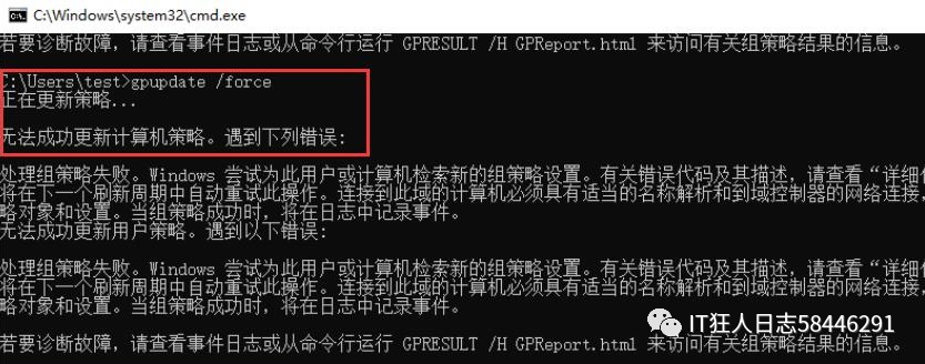 基本上排除了客户端的问题,用一台测试用的win10虚拟机测试,发现同样的故障现象,并且gpupdate /force,更新组策略失败。