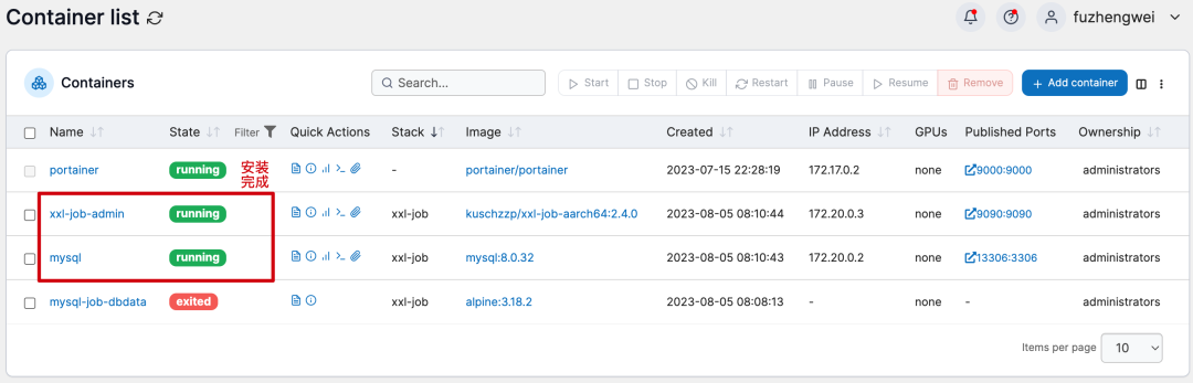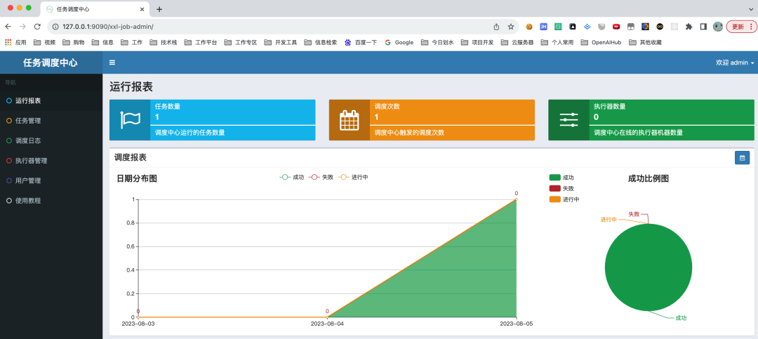 # /usr/local/bin/docker-compose -f /docs/xxl-job/xxl-job-docker-compose.yml up -d - 比较适合在云服务器上执行。这里小傅哥把 SQL 文件下载到了本地,用于初始化安装使用depends_on - 依赖于谁先安装、MYSQL_ALLOW_EMPTY_PASSWORD: 'yes' - 可以设置MySQL无密码安装、mysql-job-dbdata - 一个启动安装数据库初始化脚本的镜像。并且需要在 MySQL 安装时使用 volumes_from 标签引入。地址:http://127.0.0.1:9090/xxl-job-admin - admin/123456 - 安装后稍等启动完成,就可以访问啦。