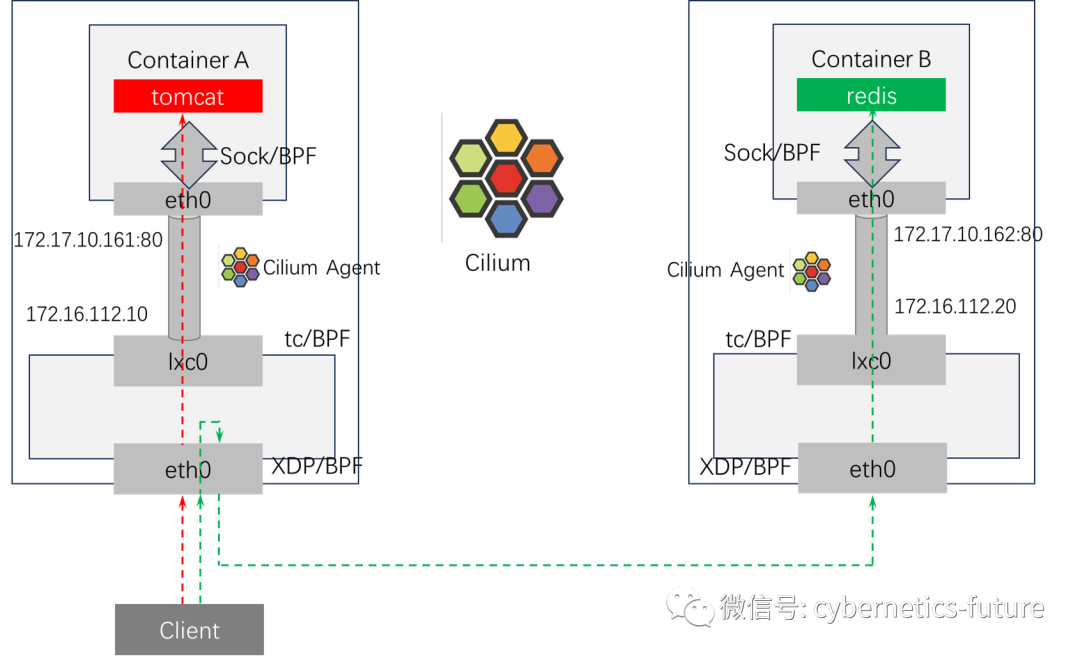 如图,来自client的访问(南北向流量)到达node 172.16.112.10时,172.16.112.10的XDP层会匹配规则,当它发现访问的目的是redis对应的service,会将流量送到redis对应的Pod,而如果发现访问的目的是tomcat对应的service,会送到本机tomcat对应的pod。