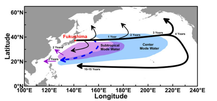 模型显示:第1年里,主要的氚污染从日本沿海迅速沿着黑潮扩散出去。随后,这些受污染的水逐渐传播,通过北太平洋洋流在4到5年内达到了太平洋东北部。10年后,由于水流和扩散作用,几乎整个北太平洋都受到了污染。