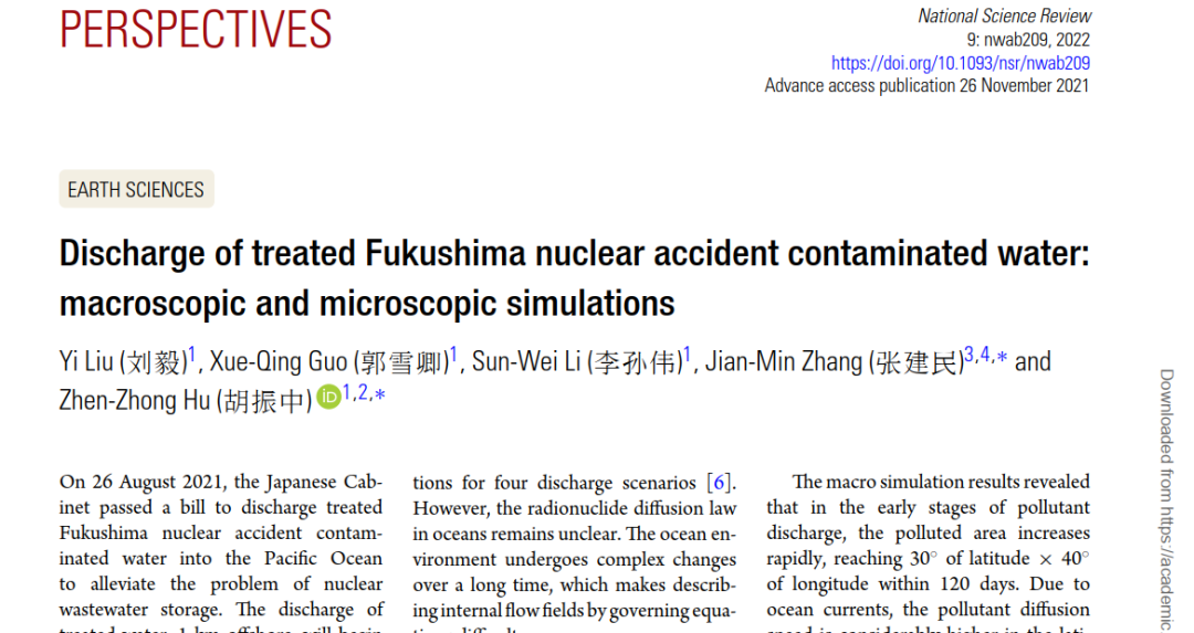 目前,相关论文已经发表在《国家科学评论》(National Science Review)期刊上,题目为:《福岛核事故处理水的排放——宏观与微观模拟》(Discharge of treated Fukushima nuclear accident contaminated water: macroscopic and microscopic simulations)。