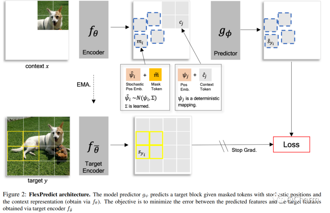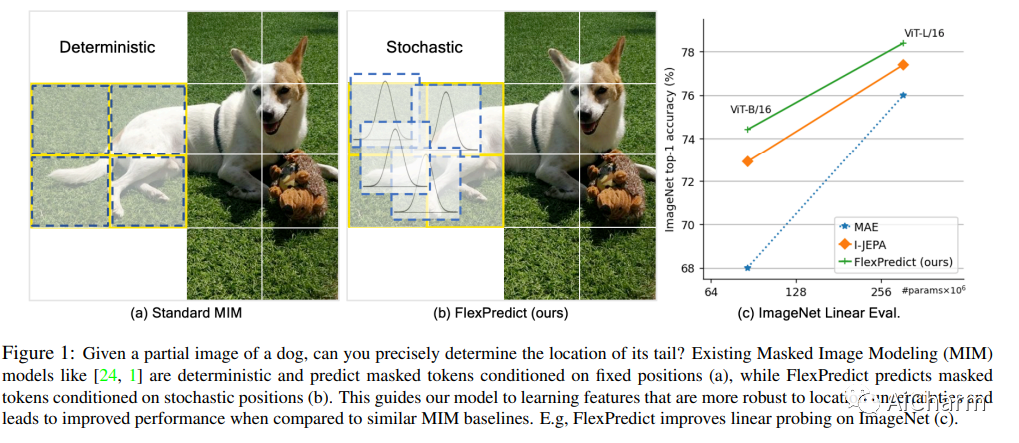 自监督学习是深度学习中一种有前途的范例,它可以通过构建需要学习有用表示的借口任务来从未标记的数据中进行学习。在自然语言处理中,占主导地位的借口任务是掩码语言建模(MLM),而在计算机视觉中,存在一个等效的任务,称为掩码图像建模(MIM)。然而,MIM 具有挑战性,因为它需要预测准确位置的语义内容。例如,给定一张不完整的狗图片,我们可以猜测有一条尾巴,但我们无法确定它的确切位置。在这项工作中,我们提出了 FlexPredict,这是一种随机模型,通过将位置不确定性纳入模型来解决这一挑战。具体来说,我们将模型置于随机掩码标记位置上,以引导模型学习对位置不确定性更稳健的特征。我们的方法提高了一系列任务的下游性能,例如,与 MIM 基线相比,FlexPredict 使用 ViT-B 将 ImageNet 线性探测提高了 1.6%,将使用 ViT-L 的半监督视频分割提高了 2.5%。