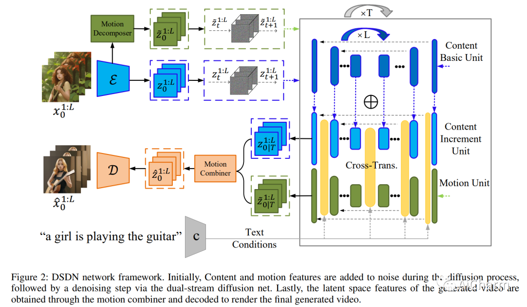 随着扩散模型的出现,最近文本到视频的生成引起了越来越多的关注。但其中的一个重要瓶颈是生成视频往往会带有一些闪烁和伪影。在这项工作中,我们提出了一种双流扩散网络(DSDN)来提高生成视频时内容变化的一致性。特别是,设计的两个扩散流,视频内容和运动分支,不仅可以在它们的私人空间中单独运行以产生个性化的视频变化和内容,而且还可以通过利用我们设计的在内容和运动域之间良好地对齐。跨变压器交互模块,这将有利于生成视频的流畅性。此外,我们还引入了运动分解器和组合器来方便对视频运动的操作。定性和定量实验表明,我们的方法可以产生闪烁更少的令人惊叹的连续视频。