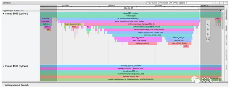 从跟踪中我们可以看到,该函数由多个小块组成,每个小块最终映射到一个单独的 CUDA 内核,该内核通过 CudaLaunchKernel 调用加载到 GPU 上。理想情况下,我们希望减少 GPU 内核的总数,从而减少 CPU 和 GPU 之间的交互量。一种方法是尽可能选择更高级别的 PyTorch 运算符,例如 torch.nn.NLLLoss。此类函数被认为将底层操作“融合”在一起,因此需要较少数量的总体内核。