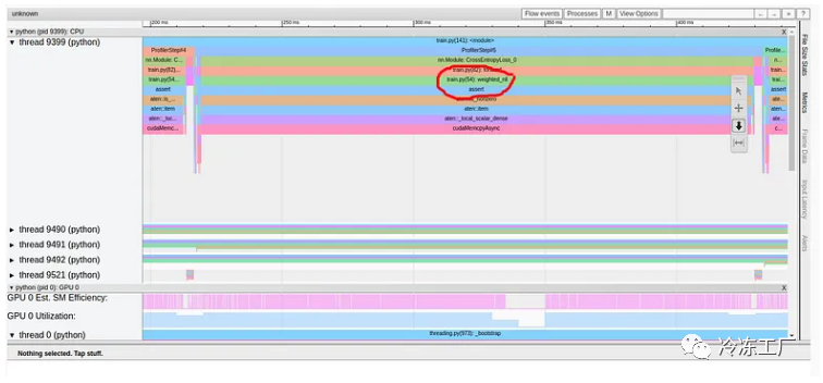 如上所述,仅交叉熵损失的前向传递就占用了训练步骤 216 毫秒中的 211 毫秒!这清楚地表明出现了问题。与模型相比,我们的损失函数包含少量计算,并且当然不应该占步骤时间的 98%。仔细观察调用堆栈,我们可以看到一些函数调用增强了我们的怀疑,包括“to”、“copy_”和“cudaStreamSynchronize”。这种组合通常表明数据正在从 CPU 复制到 GPU——我们不希望在损失计算过程中发生这种情况。在这种情况下,我们的性能问题也与 GPU 利用率的短暂下降相关,如图中突出显示的那样。然而,这并非总是如此。通常,GPU 利用率的下降与性能问题并不相符,或者可能根本看不到。