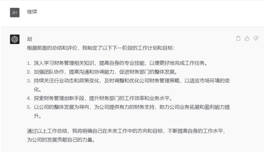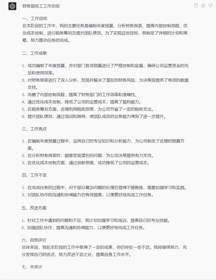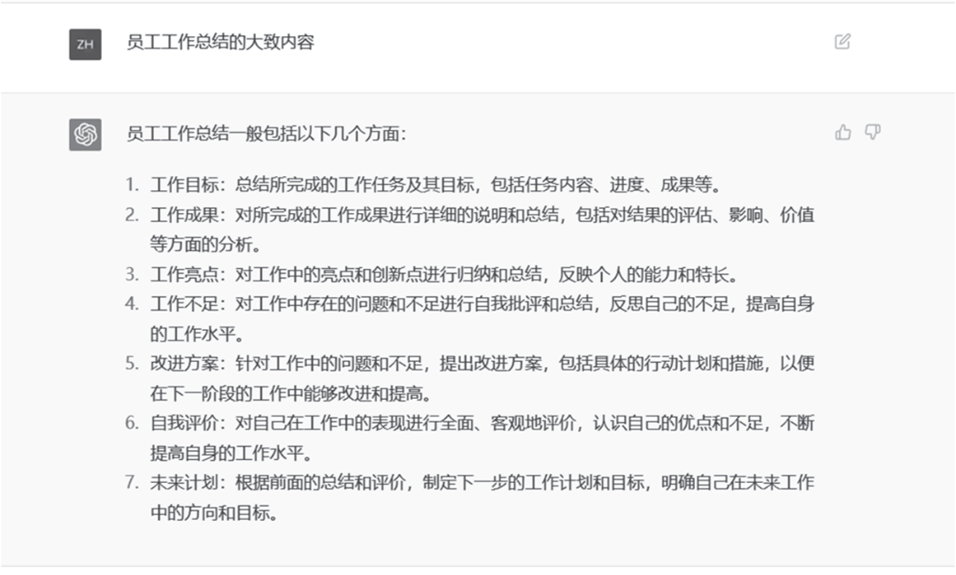 Step 1:确立文章框架。将需求提交给ChatGPT,让ChatGPT 生成员工工作总结 的大致内容。ChatGPT 能理解的话术如下: