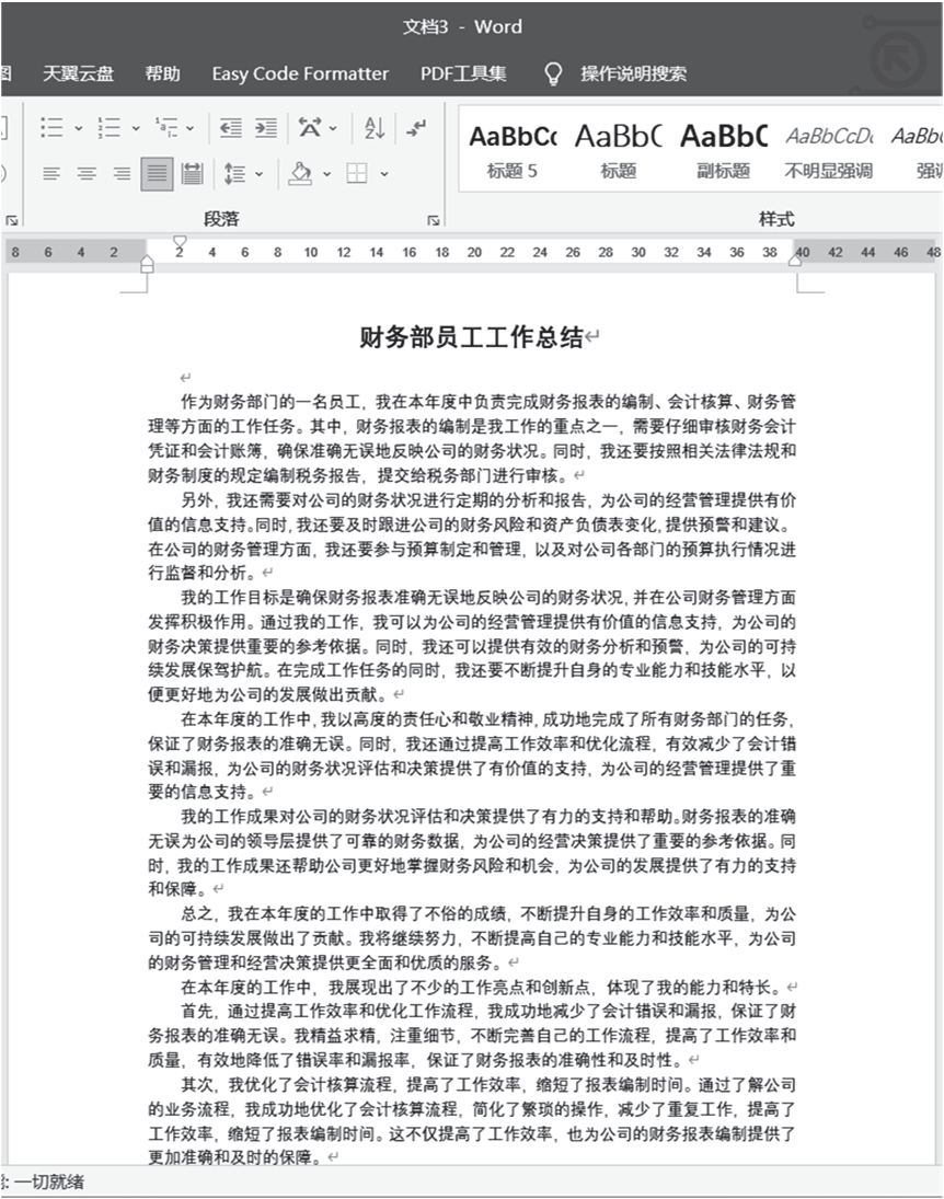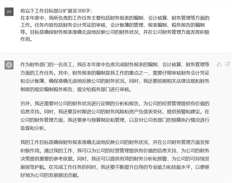 现在我们已经完成了第一部分的内容扩充,将工作目标部分扩充到 300 字左右。用同样的方法继续扩充其他部分的内容,最后生成的工作总结如图 4 所示,经过一轮扩充,内容更加完整、丰富,字数也达到了要求。