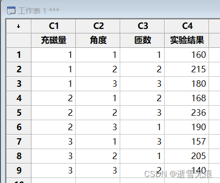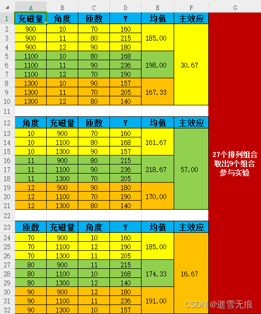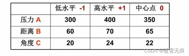 本结构化矩阵表下载移步:DOE实验设计结构化矩阵表。27个排列组合中取出9个组合,其有一定的局限性。