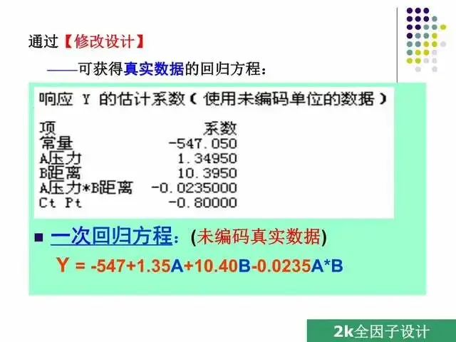 目的:特征化处理,检测因子的主效应和交互作用,建立Y对X的关系式——回归方程。