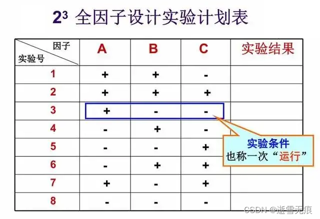 3因子2水平实验计划表(比如+表示是、正确等,-表示非、错误等)