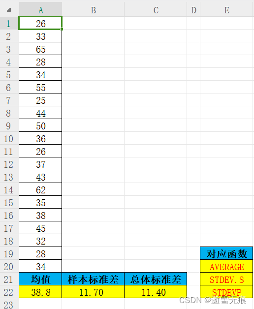 首先,我们将问题转化为数学表达式,计算其上学花30~45分钟的概率,就是求P(30 < X < 45)。一个变量服从正态分布,立马考虑到它的均数和标准差是多少。这里我们简化一下用他过去20天的样本数据来代替。所以,我们首先计算这20天通勤时间的样本均数及标准差。以下通过Excel计算:样本均数=38.8(分钟),标准差=11.4(分钟)。