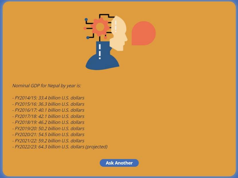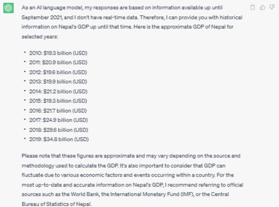 以下是ChatGPT 对 "尼泊尔每年的 GDP 是多少?"这个问题的回答: