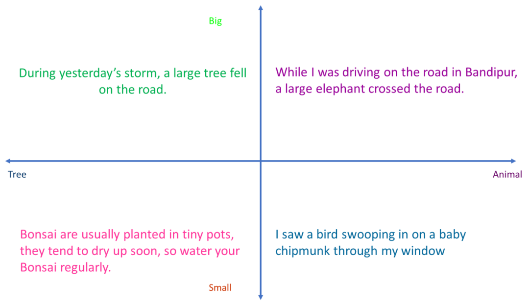 您也可以用单词或句子代替图片来做同样的事情。请注意,在上述示例中,矢量化能够捕捉语义表征,即它知道关于一只鸟俯冲向一只花栗鼠宝宝的句子应该位于(小鼠,动物)象限,而关于昨天暴风雨时一棵大树倒在路上的句子应该位于(大,树)象限。实际上,嵌入的维度不止 2 个--而是384个(句子或文本块通过BERT 变换器,输出 384个与384维相对应的数字)