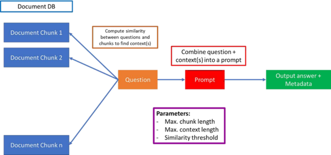 上图概述了如何构建一个基本的RAG,利用自定义文档的LLM进行问题解答。第一部分是将多个文档分割成易于管理的块,相关参数是最大分块长度。这些块应该是包含典型问题答案的典型(最小)文本大小。这是因为有时您提出的问题可能在文档的多个位置都有答案。例如,您可能会问"X 公司从2015 年到 2020 年的业绩如何?而您可能有一个大型文档(或多个文档),在文档的不同部分包含了公司多年来业绩的具体信息。在理想情况下,您希望捕获包含这些信息的文档的所有不同部分,将它们连接在一起,并根据这些经过过滤和连接的文档块传递给 LLM 进行回答。