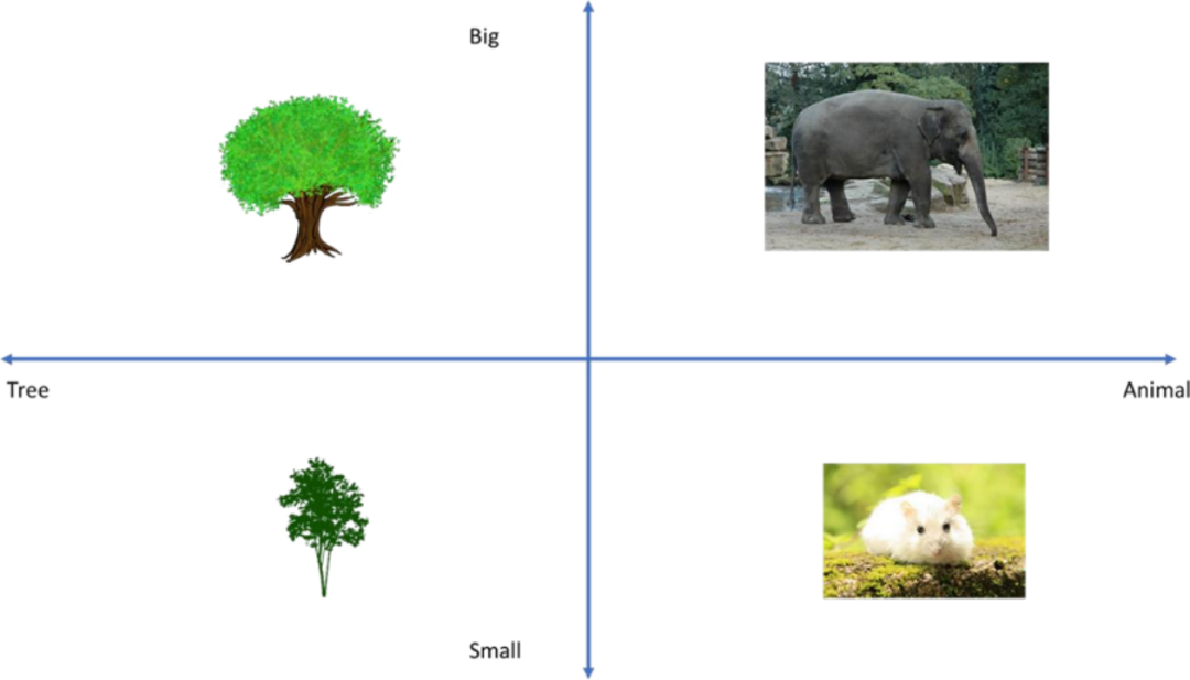 矢量化是将数据转换成多维向量。在上面的案例中,您可以看到2个维度:尺寸和类型。尺寸有 2 种(小或大),类型有 2 个种(树或动物)。这只是一个概念性的例子,当然矢量化也可以扩展到数百个维度(或更多值)。