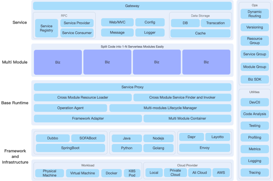对于基础设施的问题,当前有⼀些开源项⽬在尝试解决,例如服务⽹格、应⽤运⾏时,如 darp/layotto,也在实际应⽤中都得到了不错的效果。但当前服务⽹格和应⽤运⾏时更多的是将中间件以下下沉到 sidecar,⽽⼀个应⽤⼀般还包括通⽤的业务逻辑部分,要让更⼴泛的业务也能享受到⽆基础设施的体感,也需要让业务以下(可以把业务层以下的当做基础设施)都能屏蔽。另外当前对于中⼩企业来说,使⽤服务⽹格和应⽤运⾏时的成本还是⽐较⾼的。