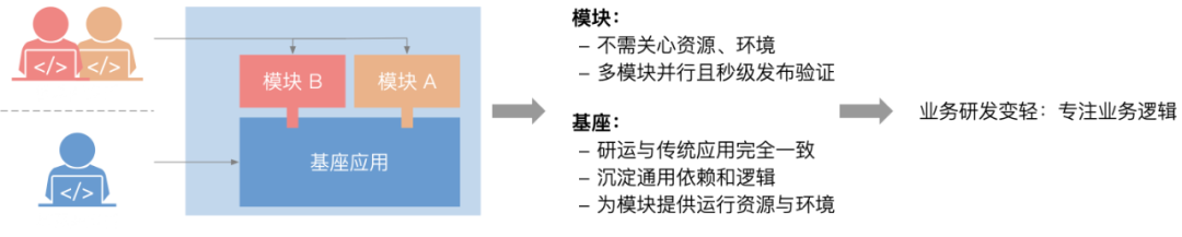 为了解决这些问题,我们对应⽤同时做了横向和纵向的拆分,纵向拆分:把应⽤拆分成基座和模块两层,这两层分别对应两层的组织分⼯,基座⼩组与传统应⽤⼀样,负责机器维护、通⽤逻辑沉淀、模块架构治理,并为模块提供运⾏资源和环境。模块在业务层以下所有的基础设施、应⽤框架、中间件可以不再关注,聚焦在业务逻辑研发本身,并且采⽤ jar 包的研发模式,具备秒级的验证能⼒,让模块开发者得到极致的提效。