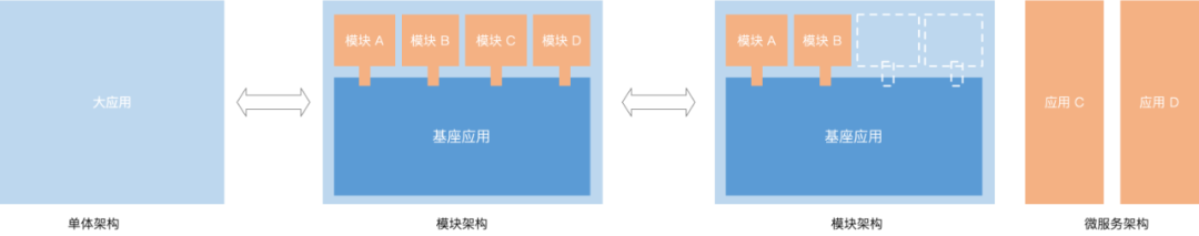 该模式的另⼀个特点是可演进、可回滚,这⾥的模块如果业务发展壮⼤,可以独⽴部署成微服务,如果微服务拆分过多,可以低成本改造成模块,合并部署在⼀起,解决资源成本和⻓期维护成本。实际上可以理解为我们是在单体应⽤架构和传统微服务架构中间,增加了⼀个可以演进过度的架构。
