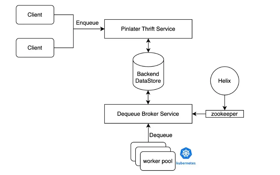 新的架构 Pacer 包含了一个无状态的 Thrift API 服务(与 Pinlater 兼容)、一个数据存储(MySQL)、一个有状态的脱队列代理服务(Dequeue Broker),以及在 Kubernetes 上运行的作业执行 Worker 池。Apache Helix(带有 Zookeeper)被用来将作业队列分区分配给脱队列代理。
